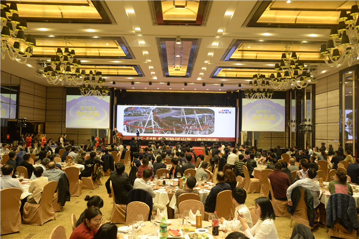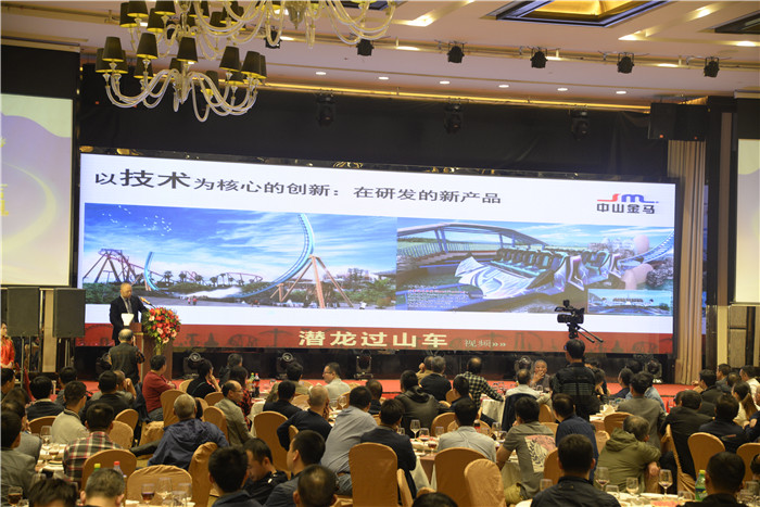 當(dāng)日,晚宴現(xiàn)場(chǎng)燈光璀璨,鮮花吐蕊;臺(tái)上歌舞升平,奏樂(lè)交織;臺(tái)下同仁相邀,觥籌談歡,其樂(lè)融融。整個(gè)宴會(huì)廳洋溢著一片和諧、溫馨、歡樂(lè)的氛圍。晚宴開場(chǎng),公司總經(jīng)理劉總上臺(tái)致辭,對(duì)座下眾賓客的到來(lái)致以熱烈的歡迎,對(duì)長(zhǎng)期以來(lái)關(guān)心和支持金馬發(fā)展的合作伙伴表示了誠(chéng)摯的感謝,并向來(lái)賓們介紹了公司的經(jīng)營(yíng)理念、企業(yè)文化、服務(wù)承諾和產(chǎn)品優(yōu)勢(shì)等。致辭中,劉總就公司最新研發(fā)和交付的產(chǎn)品作了詳細(xì)的介紹和視頻演示,斷軌過(guò)山車、垂直過(guò)山車、寬翼過(guò)山車、國(guó)內(nèi)最大飛行塔、國(guó)內(nèi)最高礦山車、室內(nèi)影視過(guò)山車等多項(xiàng)新技術(shù)、新產(chǎn)品不斷涌現(xiàn)在舞臺(tái)大屏中,真實(shí)錄制的設(shè)備運(yùn)作視頻和逼真的研發(fā)產(chǎn)品模擬情景,如磁石般吸引著諸多聚焦的目光,更贏得了眾賓客的頻頻驚喜驚艷驚嘆的贊許聲。