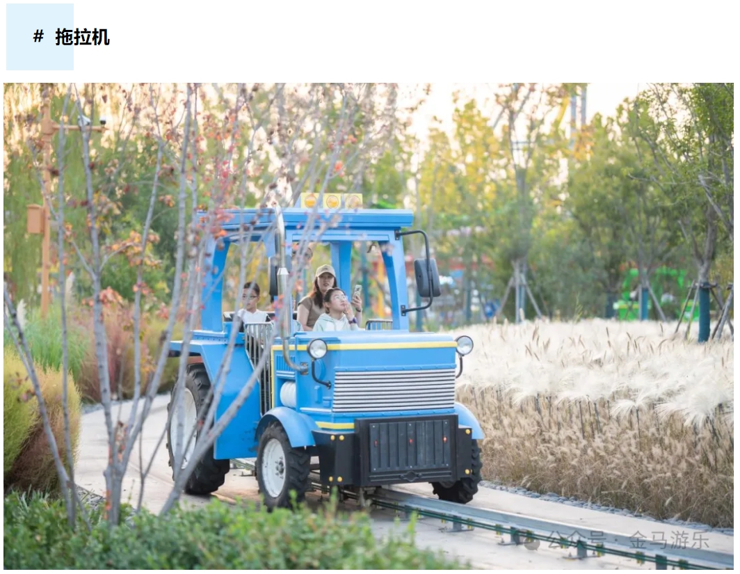 拖拉機是一款模擬農(nóng)用拖拉機造型為主題的小火車類型設備,車輛外觀造型和內飾均逼真還原真實的拖拉機,孩子可以通過把玩方向盤,手動撥桿等部件體驗駕駛拖拉機的感覺,豐富孩子的認知,增加觀光游玩的趣味性。拖拉機每輛車設置4個座位,前排為兒童座,后排為成人座,一家人乘坐拖拉機穿梭在美麗的風景中,欣賞美景的同時共享天倫之樂。