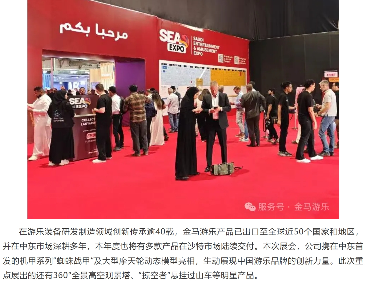 5月20日,全球游樂行業(yè)焦點之一的2025 SEA沙特展在沙特利雅得前沿會展中心盛大開幕。隨著“沙特2030愿景”加速推進,中東文旅產(chǎn)業(yè)將迎來黃金發(fā)展期。金馬游樂搶抓市場機遇,攜高品質(zhì)創(chuàng)新產(chǎn)品與全球服務(wù)方案閃耀亮相本次展會,與全球伙伴共拓中東千億級市場新機遇!