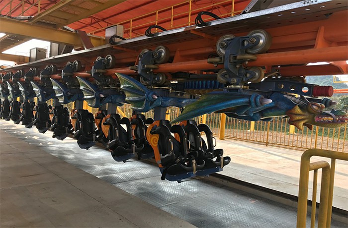 懸掛過山車的列車座椅懸掛于軌道下方,乘客懸空而坐,增加體驗(yàn)刺激度。列車經(jīng)由動(dòng)力提升到軌道最高端后,轉(zhuǎn)為沿軌道自由高速滑行,乘客坐于座椅上時(shí)盡情地享受失重、倒轉(zhuǎn)和離心的強(qiáng)烈感覺。列車外觀可根據(jù)樂園特色定制,幫助樂園打造專屬特色。