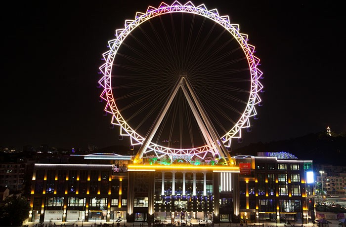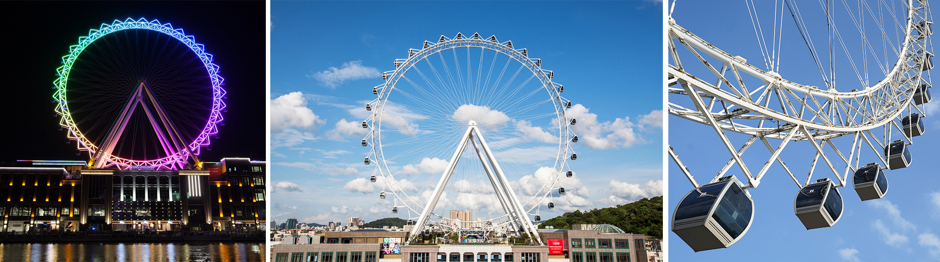 觀覽?是?套?于樓頂經(jīng)歷強(qiáng)臺?“天鴿”襲擊,仍“巋然不動”,安全使?。塔架采?圓管?字?柱結(jié)構(gòu),轉(zhuǎn)盤為輻條式,吊廂懸掛在轉(zhuǎn)盤的外側(cè)?撐架上,造型獨特新穎,轉(zhuǎn)盤結(jié)構(gòu)通透。達(dá)到?點時,距離地?的?度可達(dá)到108?,將乘客帶到?覽?遺的天空之上,俯視?圓10公?以內(nèi)的景致。